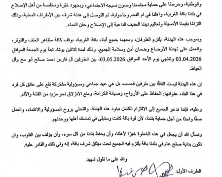 في أجواء يسودها الأمل والتفاؤل، وبفضل الله تعالى، تم قبل قليل التوصل إلى توقيع اتفاقية هدنة لمدة شهر بين عائلتي ال فارس أحمد صالح أبو مخ وال العياط في باقة...