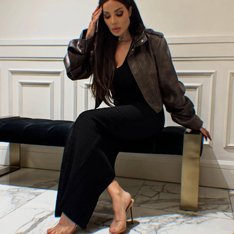 كما أكملت النجمة اللبنانية الإطلالة بجاكيت جلد باللون الزيتي، أما الحذاء فكان بكعب عال، هل أعجبك اختيارها؟