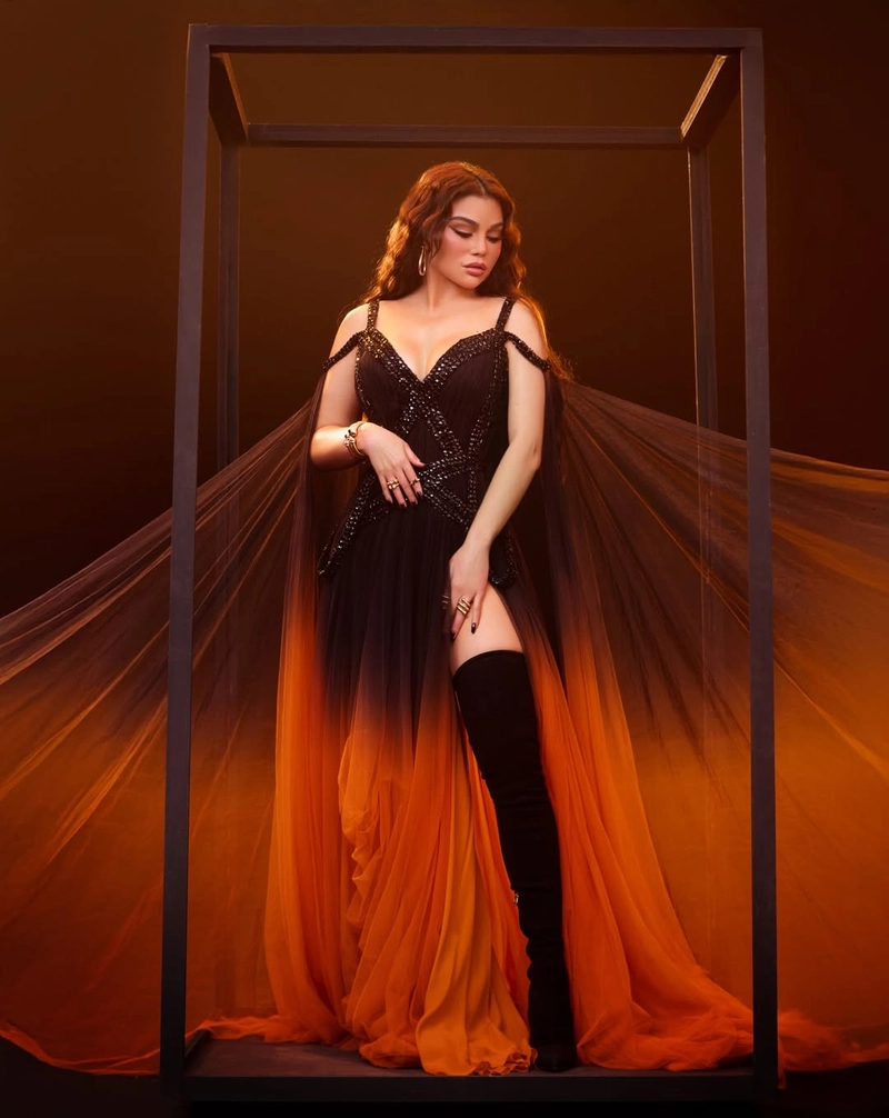نشرت هيفاء صورًا عبر "إنستغرام" بفستان أسود من الأعلى ومنسدل بشكل انسيابي وبتدرجات اللون البرتقالي من الأسفل، أكملت هيفاء اللوك بمجوهرات ذهبية اللون، كما اعتمدت بوت طويلا جدا أسود اللون مع الفستان.