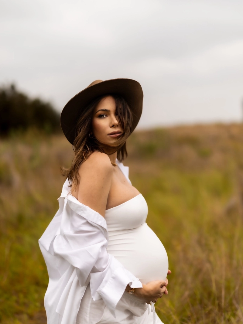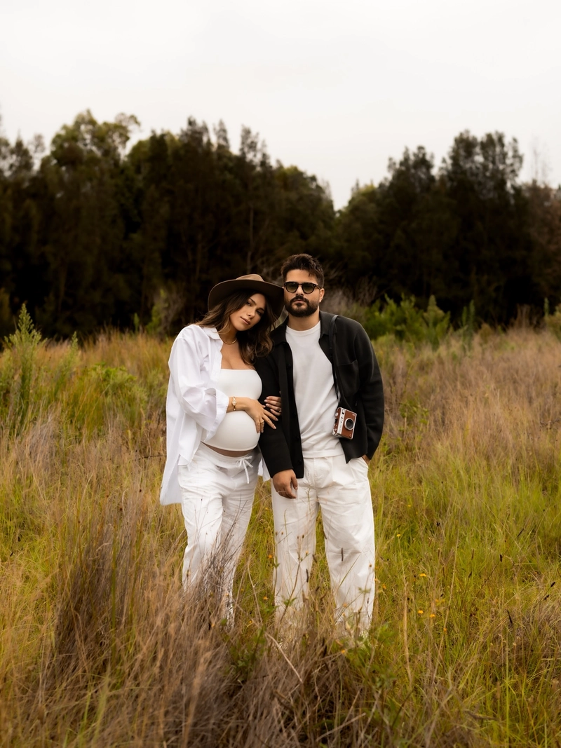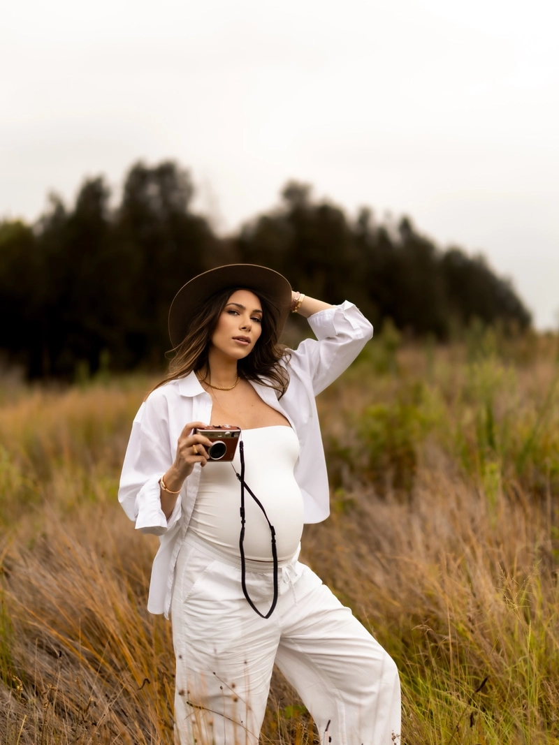 اختارت دانييلا لوكاً أنثوياً هادئاً باللون الأبيض، مع توب قصير يبرز بطن الحمل وبنطال واسع مريح، ونسّقت معهما قميصاً أبيض مفتوحا، فيما أضافت القبعة طابعاً بوهيمياً متناغماً مع أجواء الطبيعة.