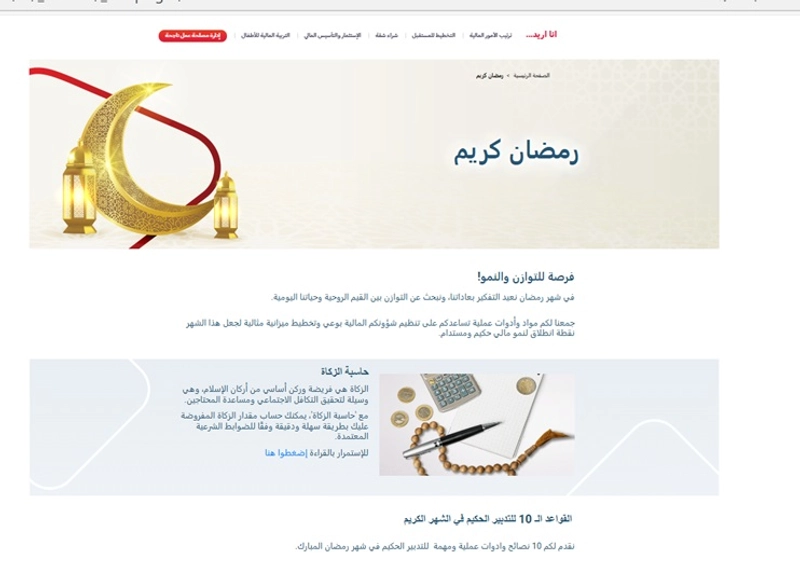 يوفر الموقع للزبائن أدوات بسيطة وعملية لإدارة مالية سليمة، مع إتاحة المعرفة المالية باللغة العربية وبما يتلاءم مع قيم الشهر وخصائصه.