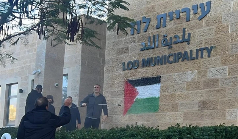 رسم مجهولون العلم الفلسطيني على جدار مبنى بلدية مدينة اللد، الليلو الماضية.
