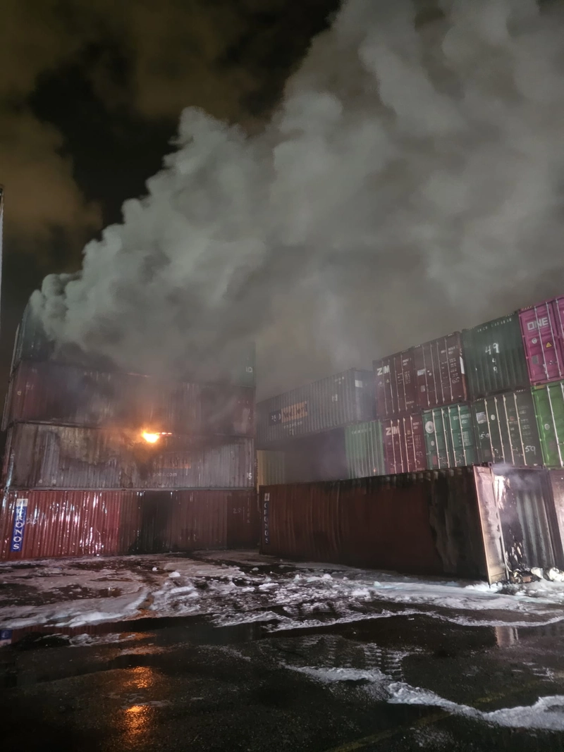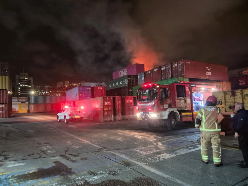 تعمل طواقم الإطفاء والانقاذ على إخماد حريق اندلع إثر سقوط شظية صاروخ في ساحة لتخزين الحاويات بمنطقة شاطئ شيمن في حيفا.