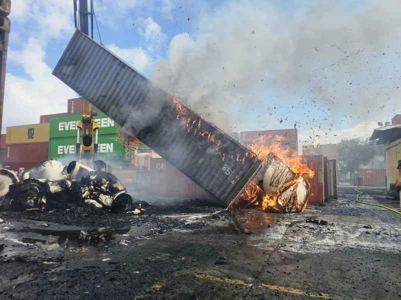 اندلع الحريق في مركز تجمع الحاويات وامتد إلى ما لا يقل عن 15 حاوية وتعمل طواقم هندسية في المكان على إخلاء الحاويات لإتاحة وصول مباشر لرجال الإطفاء إلى بؤر النيران ومواصلة أعمال الإخماد.
