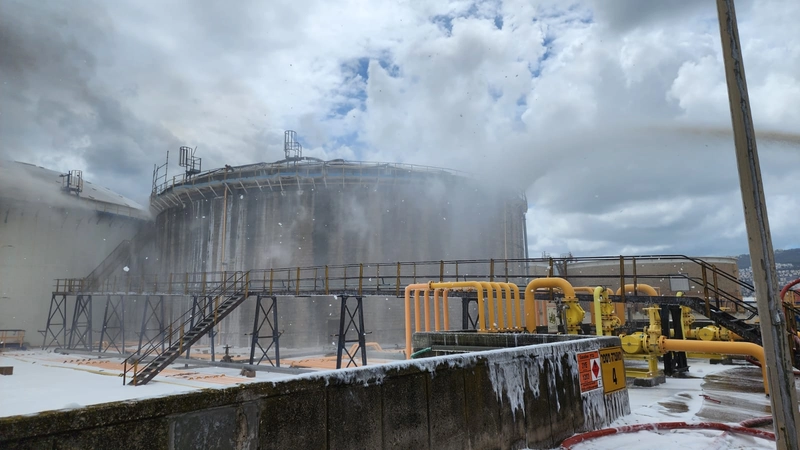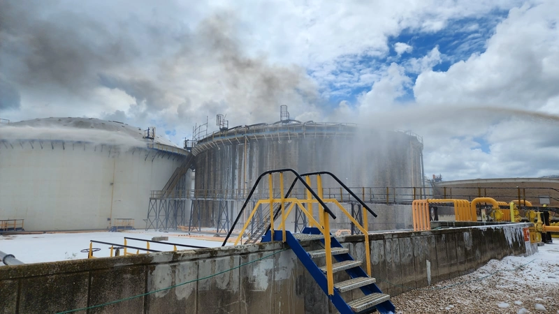 الحديث يدور عن خزان بسعة 3000 متر مكعب من البنزين وقد باشرت طواقم المنشأة بعمليات شفط الوقود من الخزان.