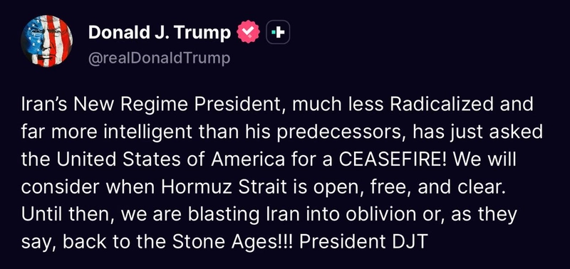 رئيس النظام الجديد في إيران، وهو أقل تطرفًا وأكثر ذكاءً من أسلافه، طلب الآن من الولايات المتحدة وقف إطلاق النار! سننظر في الأمر عندما يُفتح مضيق هرمز ويُصبح خاليًا من العوائق. إلى ذلك الحين، سنقصف إيران حتى الموت، أو كما يقولون، حتى تعود إلى العصر الحجري!!!